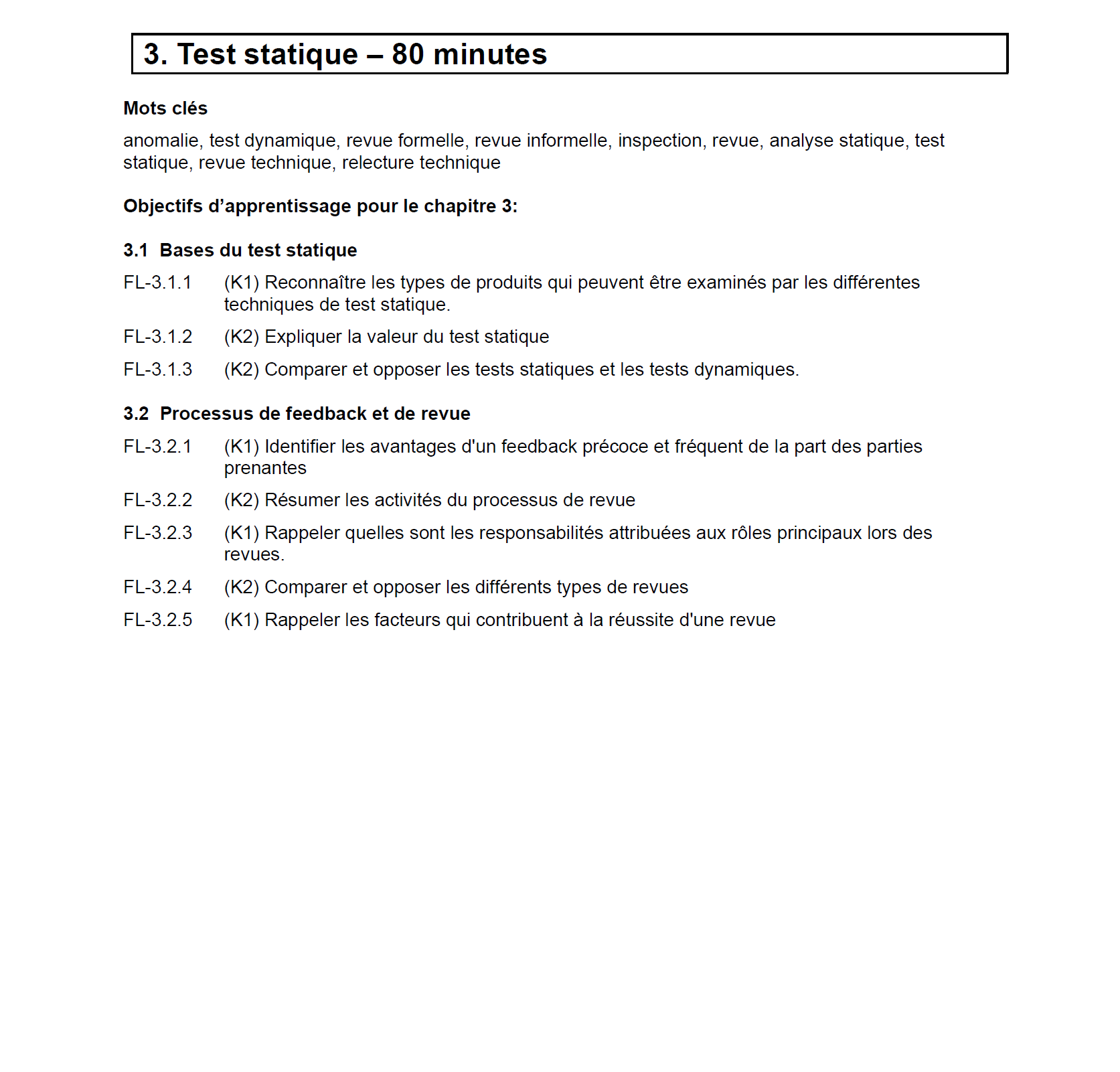 o Le candidat apprend les bases du test statique, le processus de feedback et de revue.